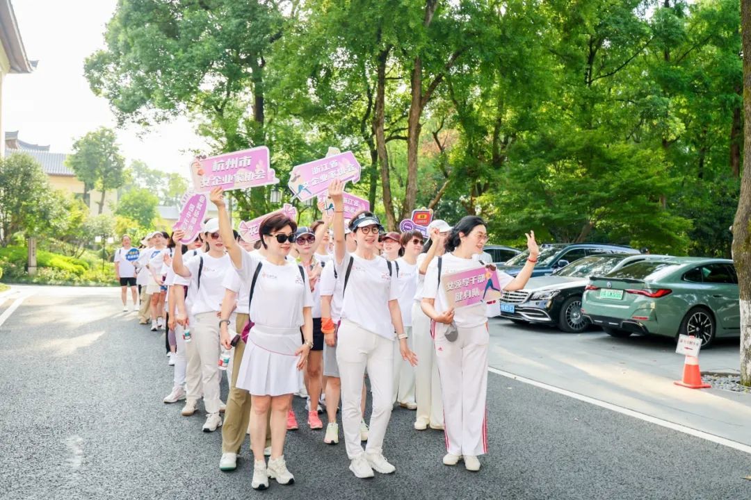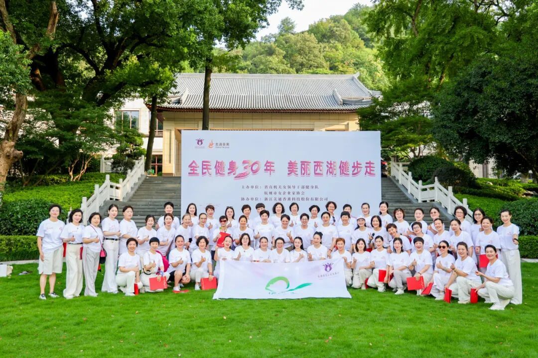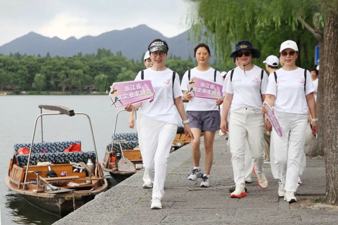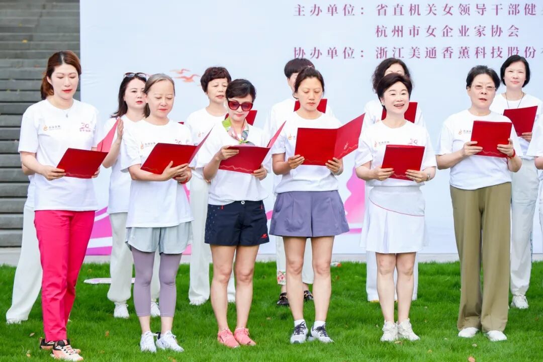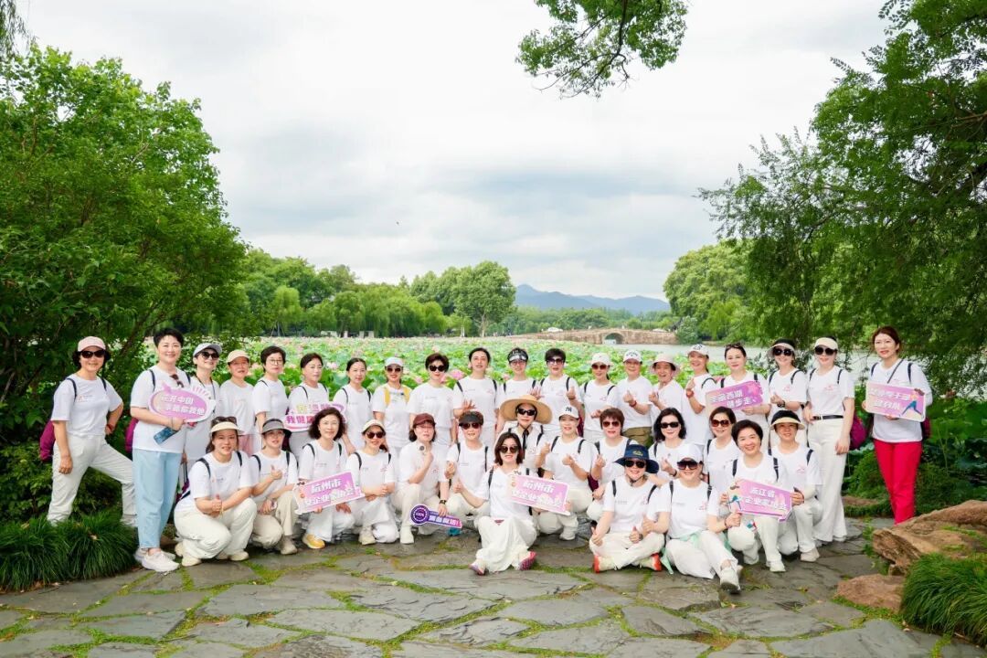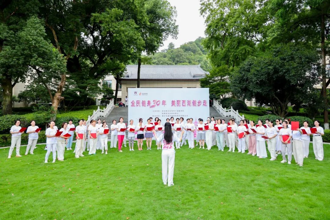 省直机关女领导干部健身队队长鲁维明、省人大常委钱晓芳,省女企业家协会会长屠红燕、顾问李虹、常务副会长、杭州市女企协会长徐力等近百位巾帼翘楚,身着统一文化衫,以步履丈量湖山,用歌声礼赞时代。