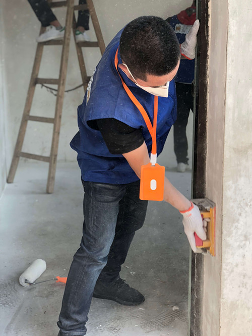 打磨墙面、重新粉刷是最脏最累的活,志愿者们干起来并不含糊,大圣老师带头“撸起袖子加油干”,不顾飞扬的墙灰,用砂纸将墙面打磨干净。