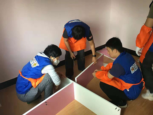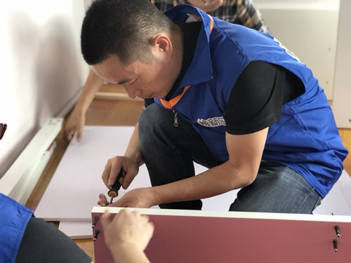 组装家具是另一项大工程,将七零八落的木板、零件变成一件件家具,着实需要一些技术和耐心,志愿者们对照着图纸,群策群力,一件件的家具也就在他们手中逐渐成形。