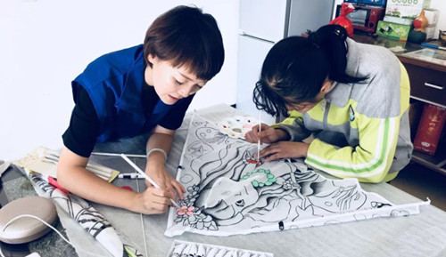 志愿者姐姐一直和小萌说话、聊天,大手牵小手和小萌一起在后山转了一圈,慢慢与小萌拉近了距离,建立起了互相信任的关系,随着渐渐熟络,志愿者也拿出了早已准备的道具,手绘风筝,白色的风筝面上画着一个美人鱼的轮廓,等待着它的主人为它上色。于是,小萌就和志愿者姐姐们一起,拿起了画笔。