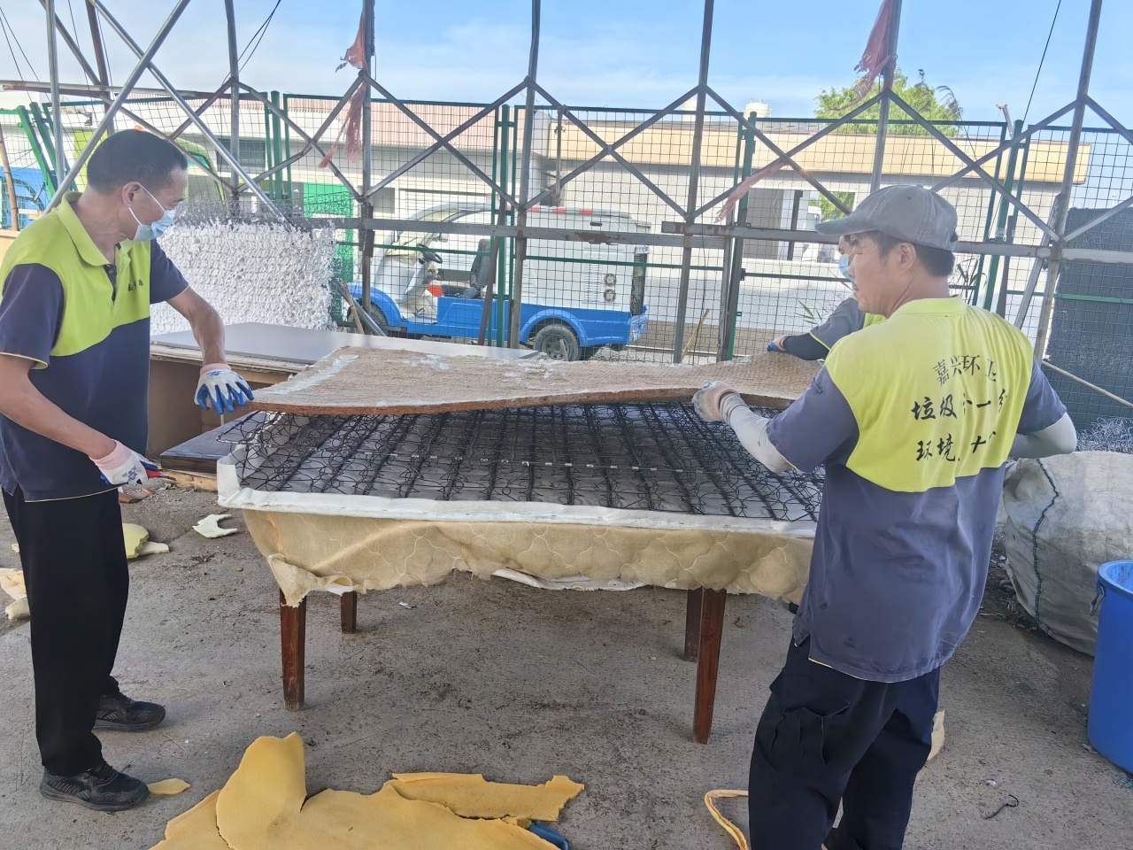 5月13日,记者走访位于南湖区的大件垃圾处置中心,一辆垃圾收运车刚刚卸下废旧床垫,拆卸工王程明和搭档宋雪华便已迅速开工。“看好咯!”王程明利落地划开床垫外皮,大约5分钟左右,便把床垫中的钢丝、海绵和废布等拆解分离。